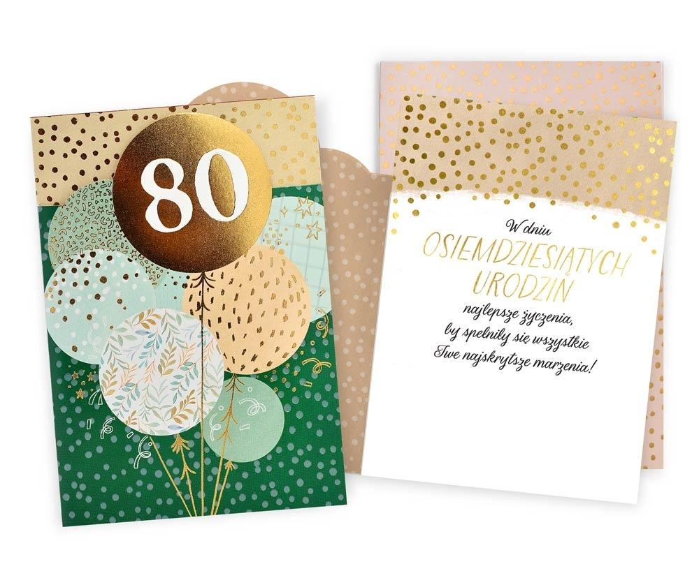 Kartka Dream Cards "Urodziny 80" DK-1256 Kartka B6 z ozdobnej serii Dream Cards - nieduża, ale robi wrażenie dzięki atrakcyjnej kolorystyce i ciekawym zdobieniom. To idealny wybór łączący przyjazną cenę z jakością. Cechy szczególne: wielkość: B6, 16.6 x 11.7 cm po złożeniu, koperta: w zestawie, kolorowa, zdobienia: kolorowe, różnorodne, bogate (w zależności od wzoru: przyklejane dekoracje, elementy biżuteryjne, odstawniki, metaliczne folie, tłoczenia itp.), okazja: urodziny