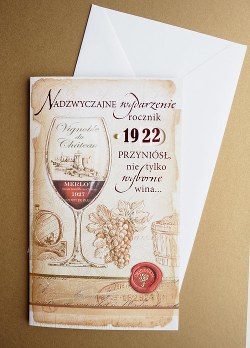 Karnet urodzinowy posiada ozdobne wytłoczenia. Błyszczące, złote elementy dodają elegancji. Możliwość wyboru rocznika na tarczy od 1900 do 1999. Wstęp do życzeń znajduje się na głównej stronie. "Nadzwyczajne wydarzenie rocznik (...) Przyniósł, nie tylko wyborne wina..." Ozdobny środek zawiera kontynuację życzeń. "... Ale głównie niezwykłych ludzi dokładnie takich jak TY Wszystkiego najlepszego." Format: 12,5x20 cm