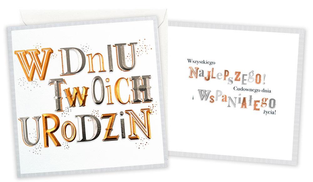 Kartka z serii Quadro to idealny pomysł na pamiątkę urodzin Kartki wyróżniają się nowoczesnym designem przedstawionym w prostej formie. Środek każdej kartki posiada specjalnie dopasowane życzenia z miejscem na własną dedykację. Całość idealnie dopełnia koperta zaprojektowana z dbałością o każdy detal pasujący do kartki. Cechy szczególne: wielkość: 15.5 x 15.5 cm po złożeniu koperta: stylistycznie dopasowana do kartki zdobienia: połyskująca folia okazja: urodziny