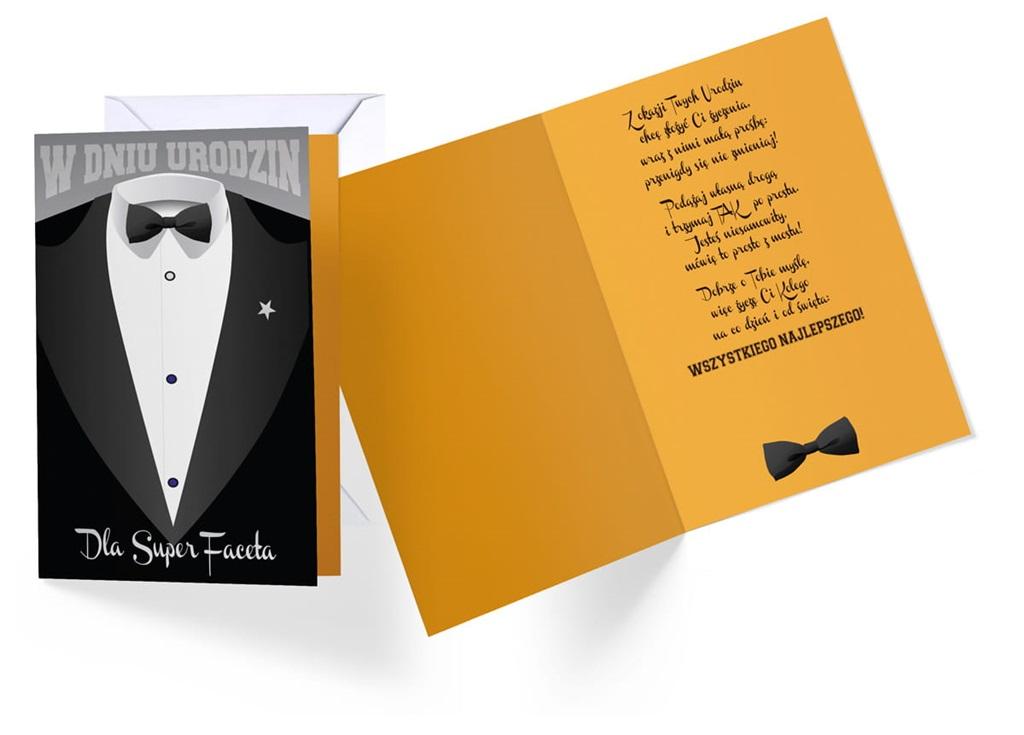 Kartka wielkości B6, zdobiona w zależności od wzoru metaliczną folią lub brokatem, kartka z tekstem w środku, kolorowa w środku i na zewnątrz.