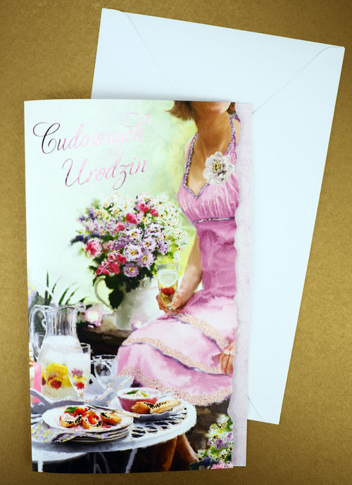 Karnet z życzeniami i kopertą, posiada ozdobne wytłoczenia. Subtelne, błyszczące zdobienia nadają całości oryginalnego wyglądu. Wewnątrz kolorowy, ozdobny środek z życzeniami. "W tym Uroczystym Dniu z okazji Urodzin, szczere i serdeczne życzenia: długich lat życia przepełnionych zdrowiem i szczęściem. Pogody ducha, pomyślności i ludzkiej życzliwości. Dni pełnych słońca i radości oraz wszystkiego co najpiękniejsze i najmilsze w życiu. Życzy..." Format: 11,5x19 cm