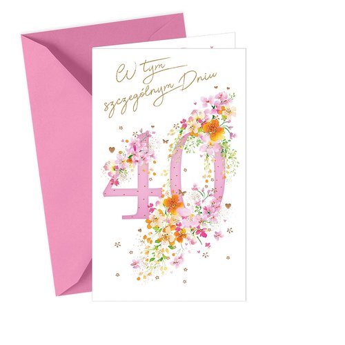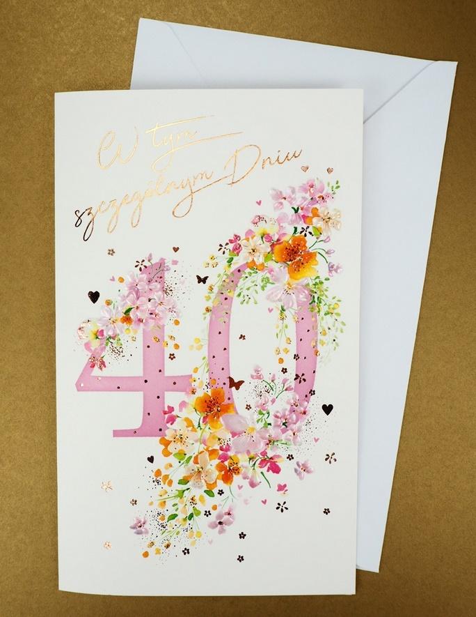 Karnet posiada ozdobne wytłoczenia. Błyszczące, metaliczne elementy dodają uroku i elegancji. Wewnątrz karnetu ozdobny środek i życzenia: "Czterdzieści lat to 14611 dni każdy z nich był inny. jeden zwyczajny, następny cudowny, każdy dzień miał swoje znaczenie, i warto było żyć. Dlatego należy to odpowiednio uczcić! Wiele szczęścia, zdrowia i miłości i jeszcze więcej wspaniałych dni z serca życzy..." Format: 11,5x19 cm