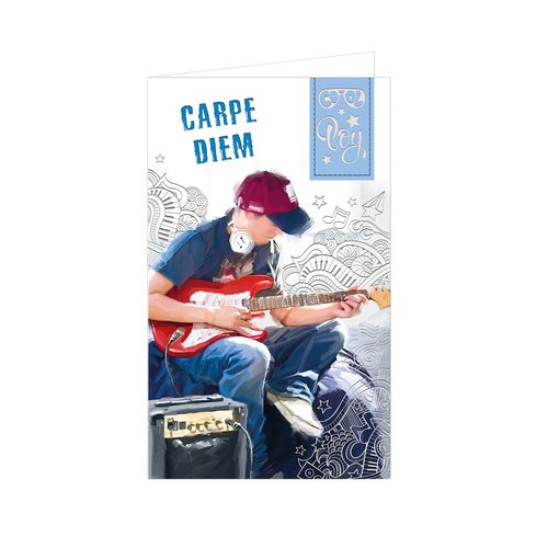 Karnet urodzinowy z kopertą. Dodatek srebrnych, wzorów nadaje całości młodzieżowego wyglądu. Wewnątrz ozdobny środek z kieszonką na pieniądze i życzenia. "Idź przez życie pewnym krokiem, w rytm Twojego serca! Bądź pomocny i pogodny, to recepta szczęścia." Format: 11,5x19 cm