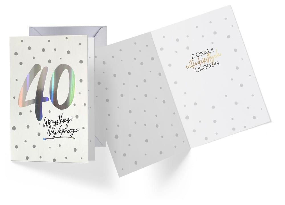 Karnet w powiększonym tzw. angielskim formacie 140x190 mm. Wykonany z niezwykłą dbałością o szczegóły, zdobiony folią holograficzną i w całości pokryty folią matową dla podkreślenia efektu prostoty i elegancji. Wewnątrz znajduje się tekst życzeń, a całość uzupełnia dedykowana koperta.