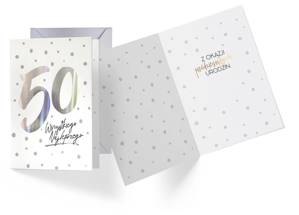 Karnet w powiększonym tzw. angielskim formacie 140x190 mm. Wykonany z niezwykłą dbałością o szczegóły, zdobiony folią holograficzną i w całości pokryty folią matową dla podkreślenia efektu prostoty i elegancji. Wewnątrz znajduje się tekst życzeń, a całość uzupełnia dedykowana koperta.