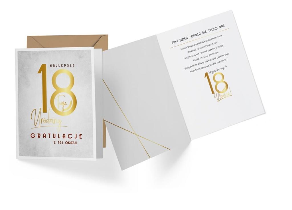 Karnet w powiększonym tzw. Angielskim formacie 140x190 mm. Wykonany z niezwykłą dbałością o szczegóły, zdobiony folią holograficzną i w całości pokryty folią matową dla podkreślenia efektu prostoty i elegancji. Wewnątrz znajduje się tekst życzeń, a całość uzupełnia dedykowana koperta.