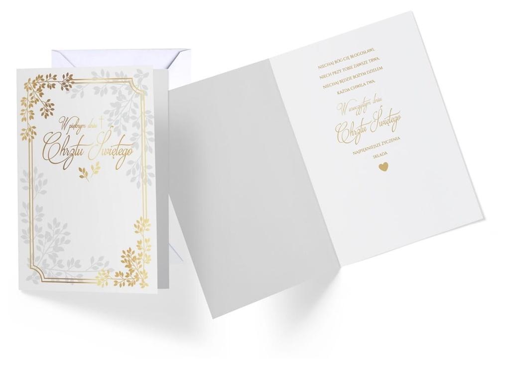 Karnet Vision ""Chrzest"" w powiększonym tzw. Angielskim formacie 140x190 mm. Wykonane z niezwykłą dbałością o szczegóły, zdobione folią holograficzną i w całości pokryte folią matową dla podkreślenia efektu prostoty i elegancji. Wewnątrz znajduje się tekst życzeń, a całość uzupełnia dedykowana biała koperta.