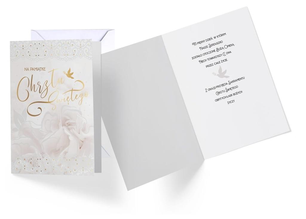 Karnet Vision ""Chrzest"" w powiększonym tzw. Angielskim formacie 140x190 mm. Wykonane z niezwykłą dbałością o szczegóły, zdobione folią holograficzną i w całości pokryte folią matową dla podkreślenia efektu prostoty i elegancji. Wewnątrz znajduje się tekst życzeń, a całość uzupełnia dedykowana biała koperta.