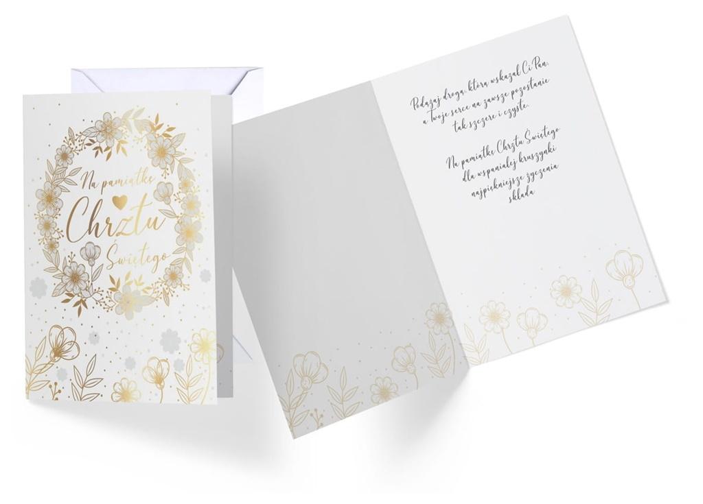 Karnet Vision ""Chrzest"" w powiększonym tzw. Angielskim formacie 140x190 mm. Wykonane z niezwykłą dbałością o szczegóły, zdobione folią holograficzną i w całości pokryte folią matową dla podkreślenia efektu prostoty i elegancji. Wewnątrz znajduje się tekst życzeń, a całość uzupełnia dedykowana biała koperta.