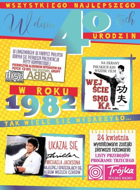 Kartka z serii To Był Rok, w których w środku i na froncie znajdują się ciekawe wydarzenia z danego roku. W powiększonym tzw. Angielskim formacie 140x190 mm. Wykonane z niezwykłą dbałością o szczegóły, zdobione metalizowaną folią. wnętrze: kolorowe, wyjątkowe życzenia w środku, w komplecie: dopasowana kolorystycznie koperta.
