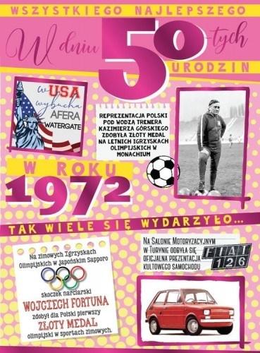 Kartka z serii To Był Rok, w których w środku i na froncie znajdują się ciekawe wydarzenia z danego roku. W powiększonym tzw. Angielskim formacie 140x190 mm. Wykonane z niezwykłą dbałością o szczegóły, zdobione metalizowaną folią. wnętrze: kolorowe, wyjątkowe życzenia w środku, w komplecie: dopasowana kolorystycznie koperta.