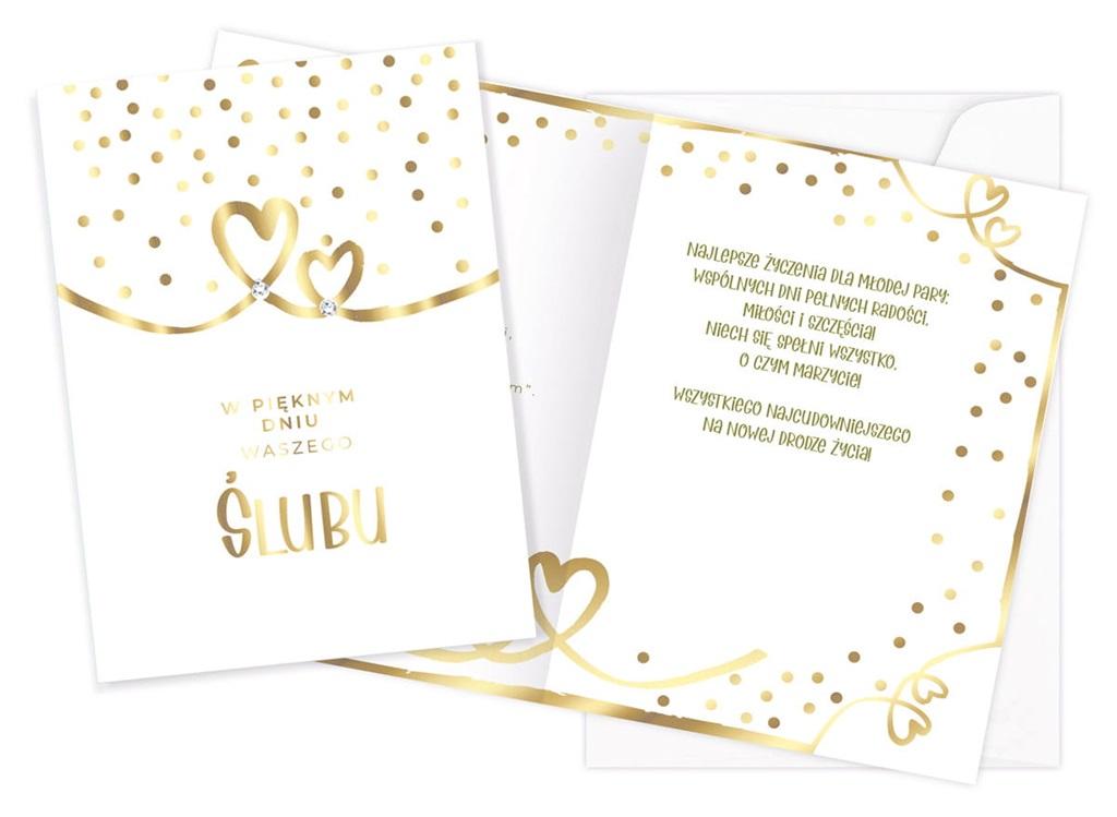 W powiększonym tzw. Angielskim formacie 140x190 mm. Wykonana z niezwykłą dbałością o szczegóły, zdobiona złotą, matową folią oraz lakierem UV dla podkreślenia wyjątkowości i elegancji. Wewnątrz znajduje się tekst życzeń, a całość uzupełnia dedykowana biała koperta. okazja: Ślub