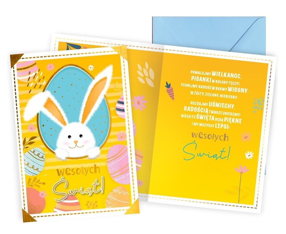 Kartka wielkości B6, zdobiona w zależności od wzoru metaliczną folią lub brokatem. Każda kartka posiada kolorowe życzenia w środku i dopasowaną kopertę w komplecie.