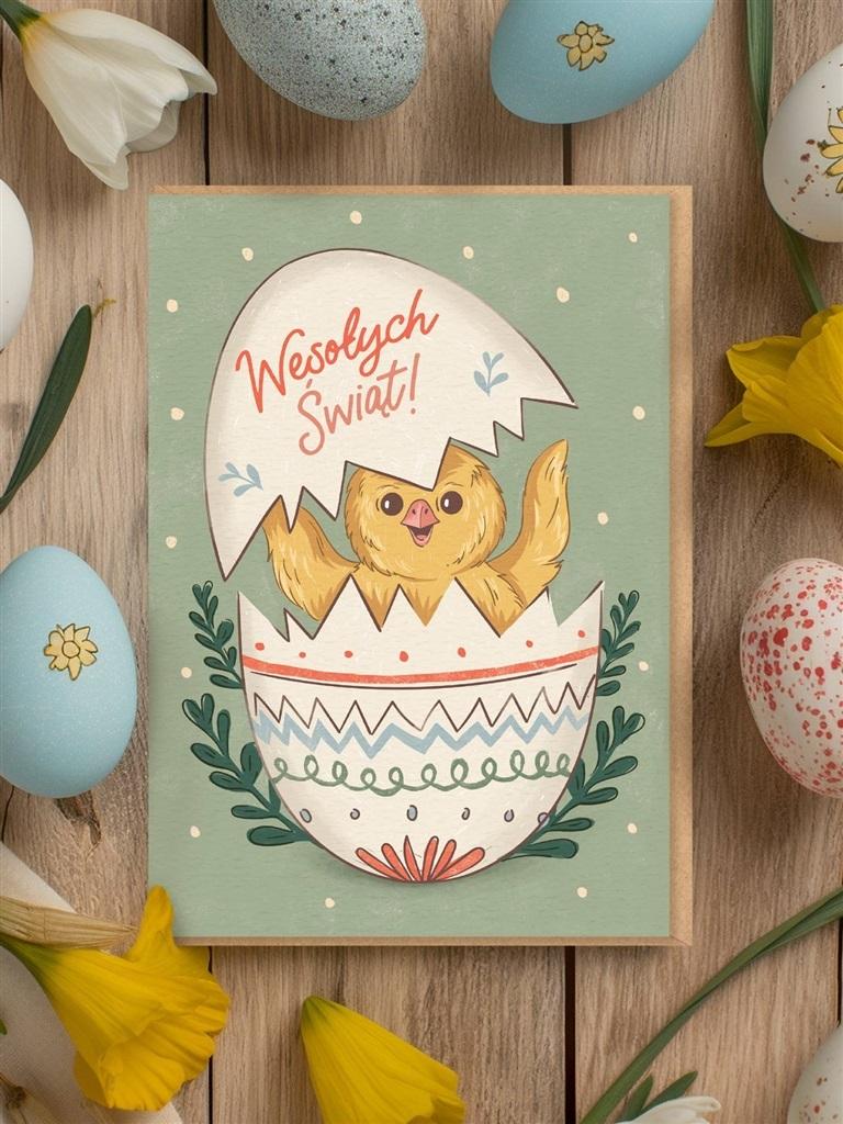 O kurczę Wesołych Świąt! Dobrze wiemy, że kartka wielkanocna musi być z jajem. Tak naprawdę to od niego wszystko się zaczęło. Jajko jest symbolem życia, a kurczak oznacza początek. Jako specjaliści w kategorii ""prezent na święta"" wiemy, jak dobrze je rozpocząć i czym najlepiej obdarować bliskich. Połączyliśmy humor i tradycję, a efektem jest kartka wielkanocna z uroczą grafiką. To wyjątkowy prezent świąteczny lub dodatek do prezentu dla babci, mamy oraz każdej bliskiej osoby. Taki upominek to skarb, bo kartka z życzeniami nie tylko przekazuje intencje, ale również buduje wspomnienia! Co będzie pierwsze, jajko czy kartka? Wszystko zależy od Ciebie. Wielkanoc tuż, tuż. Idealny prezent na Wielkanoc. Kartka okolicznościowa na Wielkanoc O KURCZĘ WESOŁYCH ŚWIĄT Wymiary kartki (po złożeniu): 12 cm x 17 cm Gramatura papieru: 250 g/m2 W zestawie elegancka koperta z eko kraftu Wymiary koperty: 12,5 cm x 17,5 cm Gramatura koperty: 100 g/m2 Zestaw zapakowany w folię Idealna kartka na Wielkanoc Wyprodukowano w Polsce