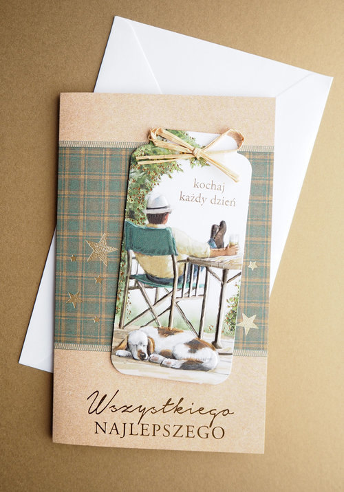 Karnet posiada ozdobne wytłoczenia, całość utrzymana jest w spokojnych, stonowanych barwach. Dodatkową ozdobą są złote, błyszczące elementy. Wewnątrz karnetu kolorowy środek i życzenia: "Człowiek osiągnął sukces, jeżeli wstaje rano, kładzie się spać w nocy, a pomiędzy tym robi to, co sam chce robić. (Bob Dylan) Spełnienia marzeń" W zestawie znajduje się biała koperta i pięknie zdobiona zakładka do książki. Format: 11,5x19 cm