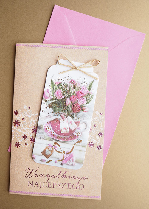 Karnet posiada ozdobne wytłoczenia w różowym metalicznym kolorze. Błyszczące, złote elementy dodają uroku i elegancji. Wewnątrz karnetu kolorowy środek i życzenia: "Życzę Ci, abyś odnalazła: w ciszy swoje myśli i marzenia, w bliskich Ci osobach siłę i piękno stworzenia, w otaczającym świecie radość istnienia, w smakach i zapachach wielkość natchnienia, a w sobie radość z życia." W komplecie koperta i pięknie zdobiona zakładka do książki. Format: 12x20 cm