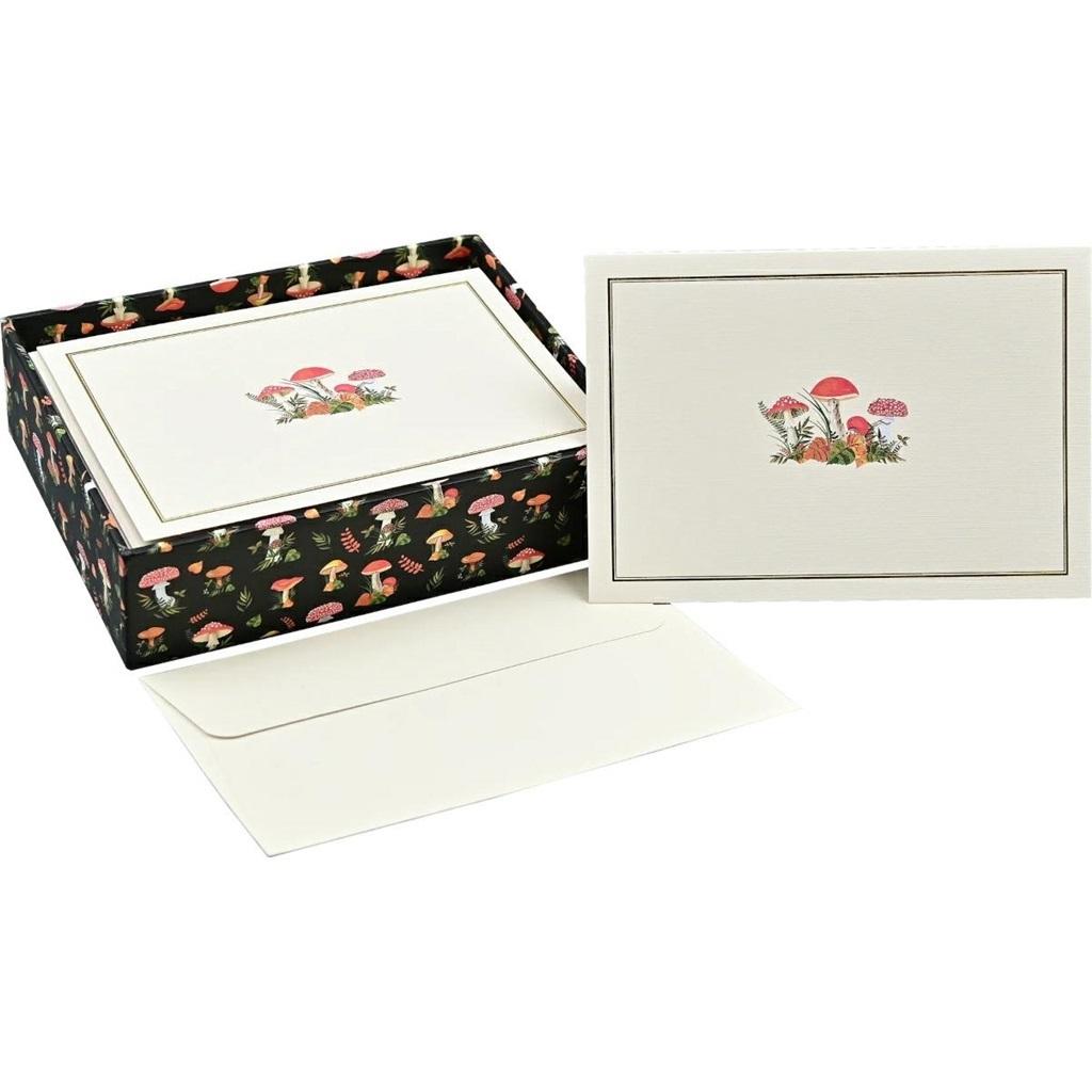 Elegancka kolekcja zdobionych karnetów na każdą okazję marki Peter Pauper Press - Grzyby (Mushrooms). Wzór na kartkach to grzyby i paprocie leśne zdobione drobinkami złotej folii. Koperty są dopasowane kolorem. Całość zapakowana w pudełko z tym samym wzorem. Uniwersalna otwierana kartka okolicznościowa z pustym środkiem pozwala na pełną personalizację i stworzenie wyjątkowej pamiątki dla obdarowanej osoby.