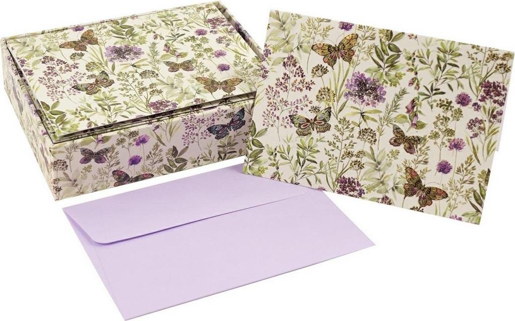 Elegancka kolekcja zdobionych karnetów na każdą okazję marki Peter Pauper Press. Wzór na każdej kartce jest lekko tłoczony, zdobiony złotą folią, połyskujący. Koperty są dopasowane kolorem i nadrukiem. Całość zapakowana w pudełko z tym samym wzorem. Uniwersalna otwierana kartka okolicznościowa z pustym środkiem pozwala na pełną personalizację i stworzenie wyjątkowej pamiątki dla obdarowanej osoby.