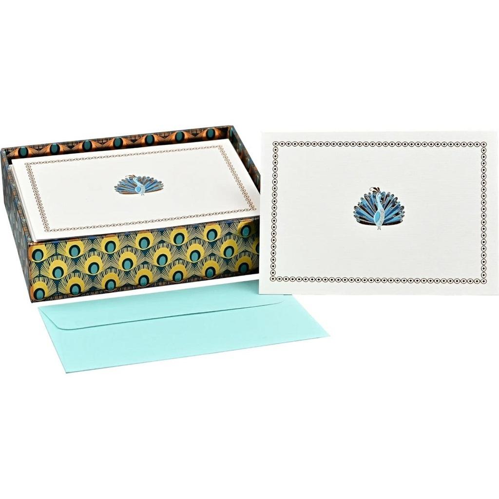 Elegancka kolekcja zdobionych karnetów na każdą okazję marki Peter Pauper Press - Paw (Peacock). Kartki z motywem błękitnego pawia stylizowanego na klejnot i dekoracyjną obwódką ze złotej folii. Koperty są dopasowane kolorem. Całość zapakowana w pudełko z tym samym wzorem. Uniwersalna otwierana kartka okolicznościowa z pustym środkiem pozwala na pełną personalizację i stworzenie wyjątkowej pamiątki dla obdarowanej osoby.
