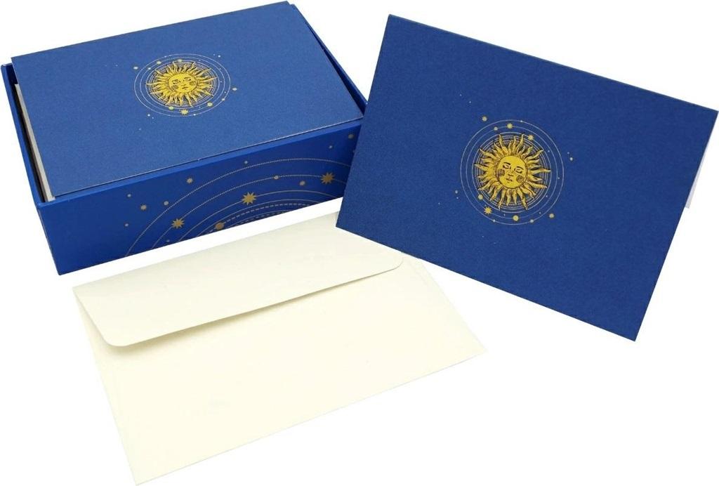 Elegancka kolekcja zdobionych karnetów na każdą okazję marki Peter Pauper Press - Słońce (Soleil). Wzór na każdej kartce jest lekko tłoczony oraz zdobiony złotą folią. Koperty są dopasowane kolorem i nadrukiem. Całość zapakowana w pudełko z tym samym wzorem. Uniwersalna otwierana kartka okolicznościowa z pustym środkiem pozwala na pełną personalizację i stworzenie wyjątkowej pamiątki dla obdarowanej osoby.