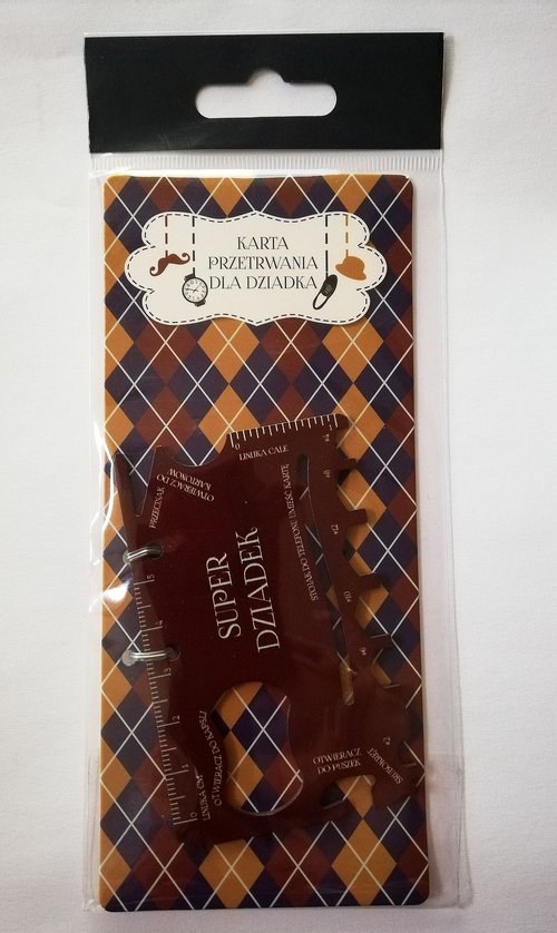 Metalowa karta przetrwania ze specjalną dedykacją dla Dziadka. Karta posiada 11 funkcji. Każda funkcja zaznaczona na produkcie, plus legenda na odwrocie blistra. Mini śrubokręt płaski. Kółko do zaczepiania linki lub zawieszenia Linijka ‘CM’ Przecinak do lin i pasów bezpieczeństwa Otwieracz do kartonów Klucze płaskie - roz: #2,#6,#10,#12,#8,#4 Stojak do telefonu Śrubokręt płaski Otwieracz do puszek Otwieracz do kapsli Linijka ’CALE’ Solidne i staranne wykonanie. Karta w rozmiarach karty kredytowej. Kolor: brązowy Materiał: metal Wymiary produktu : szer.8,5 cm wys. 5,3 cm