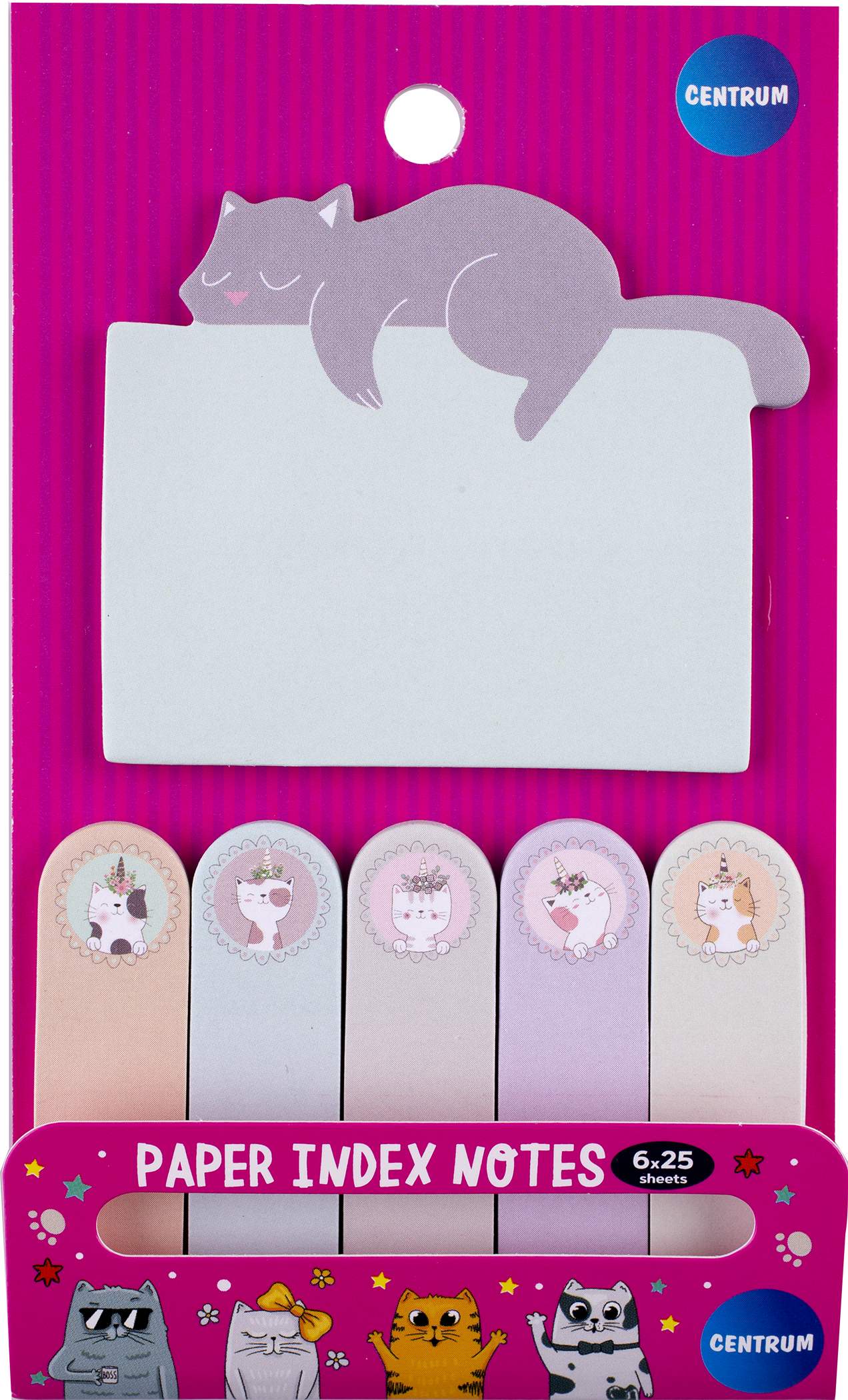 Karteczki samoprzylepne z zakładkami indeksującymi wzór kotki; 6 wzorów po 25 karteczek, wymiar: 70x60mm oraz 56x15mm.