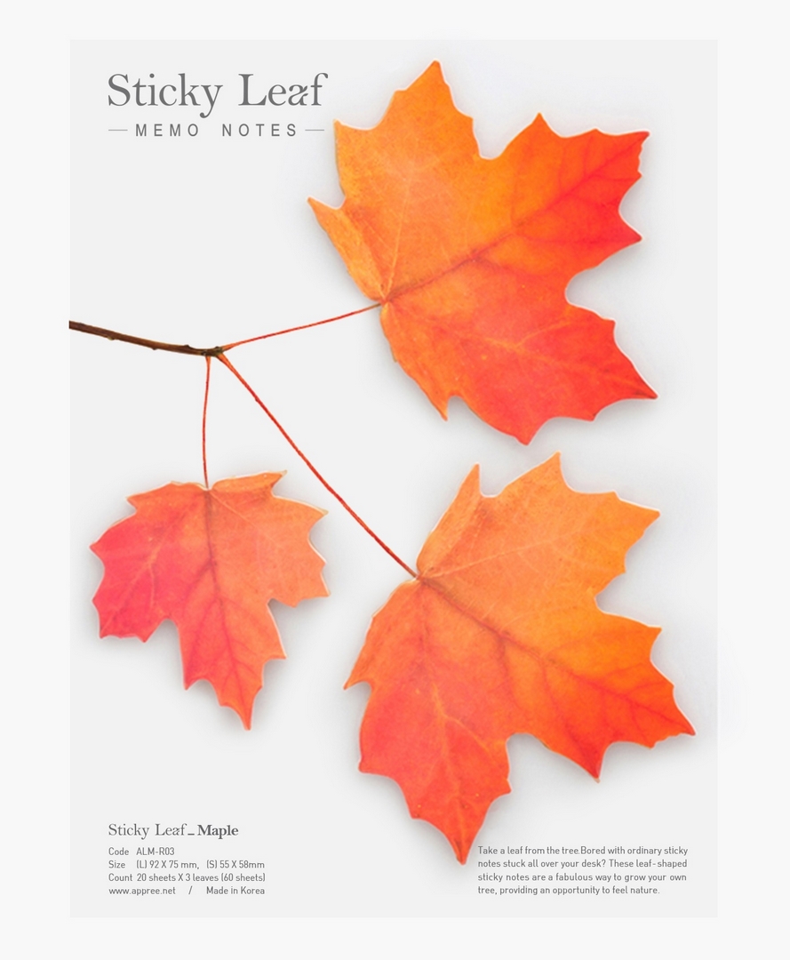 Karteczki samoprzylepne indeksujące w kształcie liści klonu. Każdy listek papieru jest samoprzylepny, dzięki temu znajdzie zastosowanie jako klasyczna kartka do notatek oraz jako zakładka indeksująca. Wykorzystasz je w domu, biurze, w planerach, książkach. W fantastyczny i kreatywny sposób można je również wykorzystać do scrappbookingu oraz bullet journalingu.