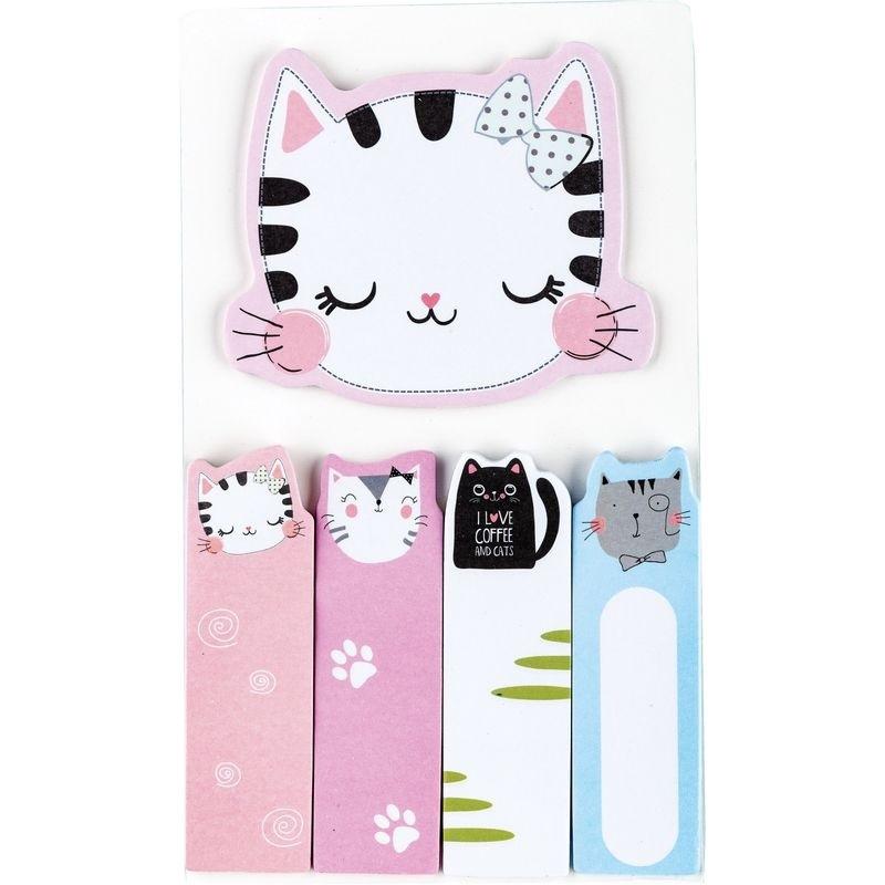 Zestaw karteczek samoprzylepnych oraz zakładek indeksujących z motywem kotów. Rozmiar karteczek samoprzylepnych 74 x 70 mm. Zakładki indeksujące 48 x 15 mm, 4 rodzaje po 15 karteczek.