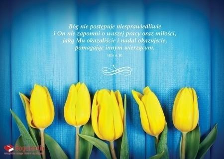 Kartka składana z kopertą z wersetem z Pisma Świętego. Bóg nie postępuje niesprawiedliwie i On nie zapomni o waszej pracy oraz miłości, jaką mu okazaliście i nadal okazujecie,pomagając innym wierzącym. Hbr 6,10