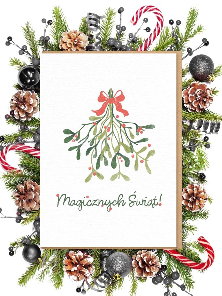 Największa magia na świecie to magia miłości! Jej symbolem jest jemioła, a zaklęciem ""kocham cię"". Życząc komuś magicznych świąt, życzy się tej osobie miłości. Kartka świąteczna MAGICZNYCH ŚWIĄT z gałązką jemioły to idealny dodatek do prezentu gwiazdkowego, zwłaszcza dla ukochanej osoby ceniącej tradycyjną korespondencję. Kartka w zestawie z kopertą jest pusta w środku. Została wydrukowana na papierze ekologicznym. Jej wnętrze czeka na wypełnienie treścią płynącą prosto z Twojego serca! Kartka bożonarodzeniowa MAGICZNYCH ŚWIĄT Wymiary kartki (po złożeniu): 12 cm x 17 cm Gramatura papieru: 250 g/m2 W zestawie elegancka koperta z eko kraftu Wymiary koperty: 12,5 cm x 17,5 cm Gramatura koperty: 100 g/m2 Zestaw zapakowany w folię Idealna kartka na święta dla zapalonego czytelnika/mola książkowego Wyprodukowano w Polsce