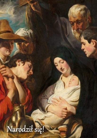 Kartka bożonarodzeniowa z preprodukcją obrazu Pokłon pasterzy, autor Jacob Jordaens.