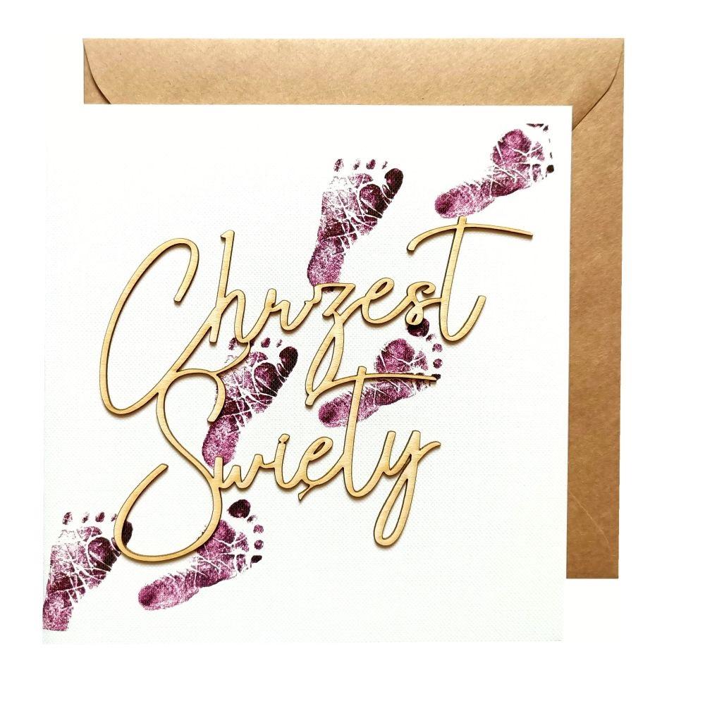 Kartka okolicznościowa z okazji Chrztu Świętego o treści: W podróży przez życie niech Cię zawsze Pan Bóg chroni i mocą Chrystusa przed pokusami obroni. Kochaj rodziców, by pociechę z Ciebie mieli, by radość w Tobie widzieli. Pamiętaj, że Bóg patrzy na Ciebie. W Dniu chrztu Świętego