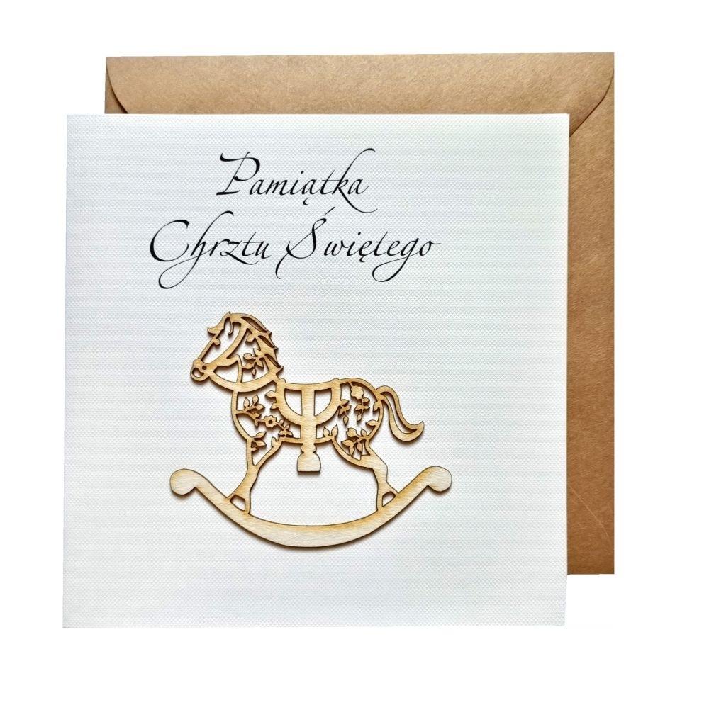 Kartka okolicznościowa z okazji Chrztu Świętego o treści: Bądź pozdrowiona dziecino w tym Dniu uroczystym, niech Twoje serce pozostanie pięknym i czystym. Oby życie Twe w szczęśliwości upłynęło, bo tak się pięknie zaczęło! Niechaj Chrzest Święty Cię mocą obdarzy i nic złego Ci się nie przydarzy! Patrz z nadzieją na całe swe życie, żyj w radości i dobrobycie!