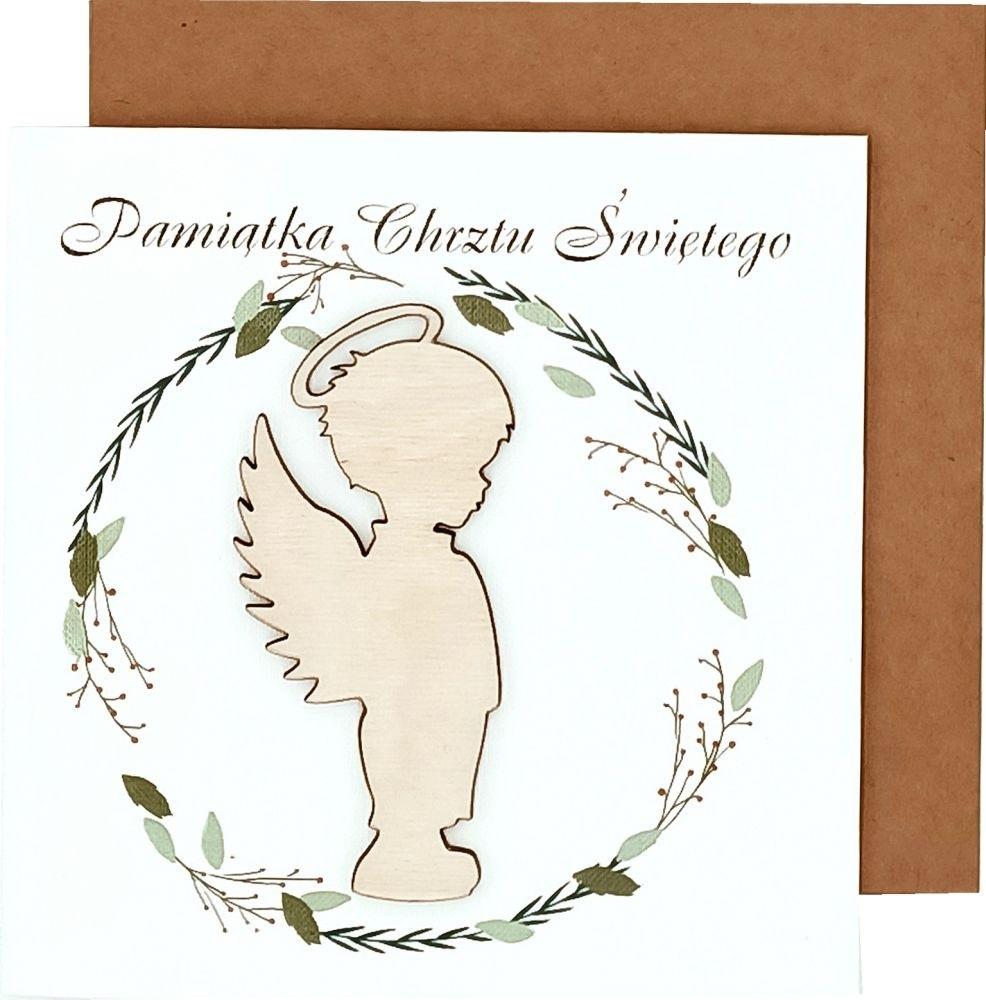 Kartka okolicznościowa z okazji Chrztu Świętego o treści: W podróży przez życie niech Cię zawsze Pan Bóg chroni i mocą Chrystusa przed pokusami obroni. Kochaj rodziców, by pociechę z Ciebie mieli, by radość w Tobie widzieli. Pamiętaj, że Bóg patrzy na Ciebie. W Dniu chrztu Świętego?