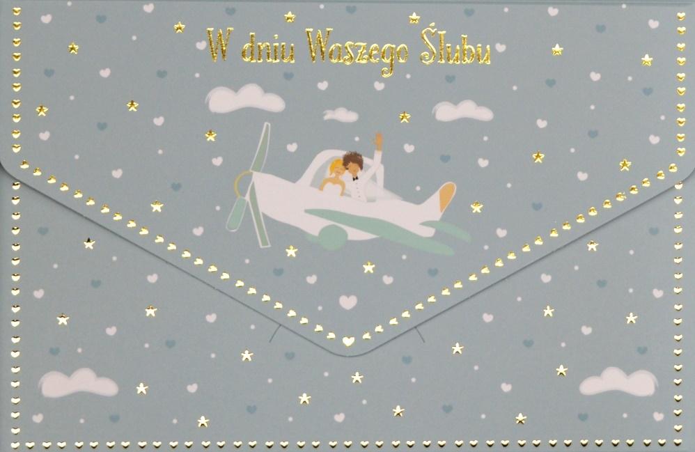 Kartka-koperta z życzeniami i kieszonką na pieniądze w środku.