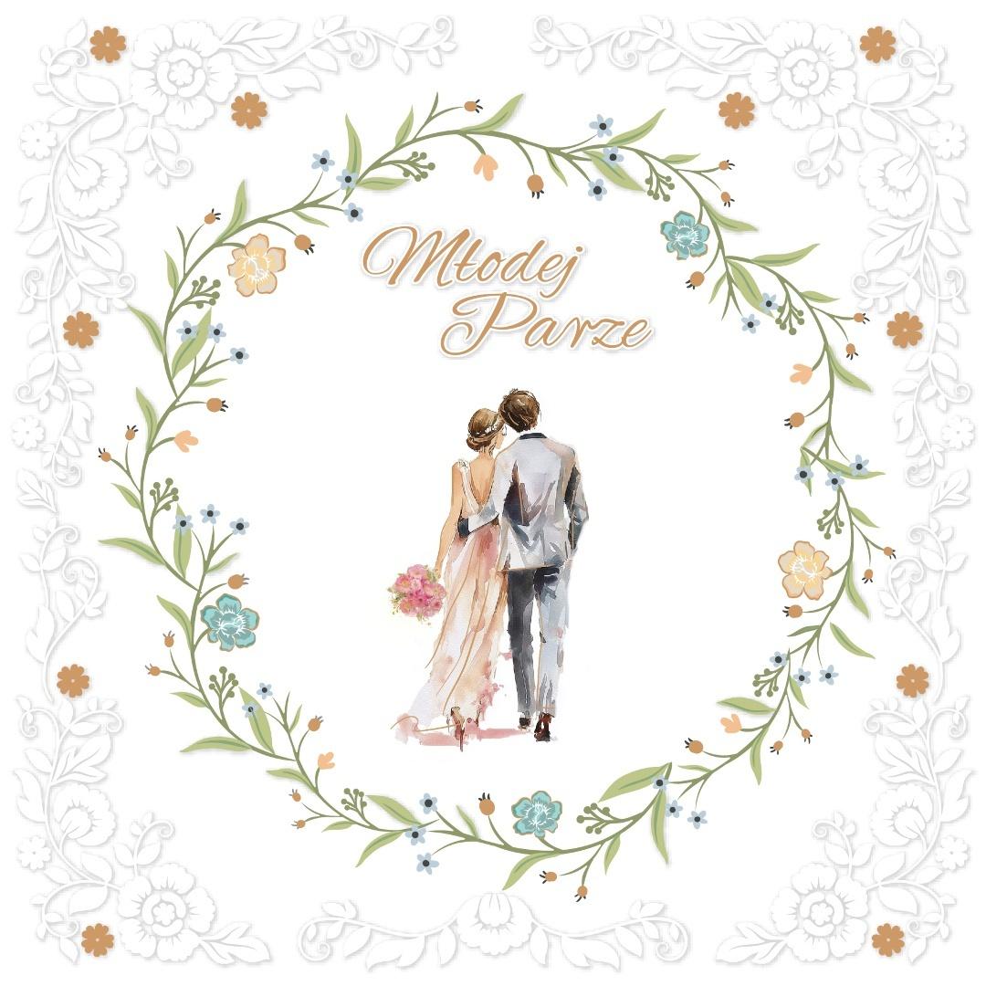 Karnet ślubny z kopertą, złocony i tłoczony, tekst życzeń w środku.