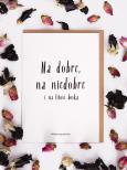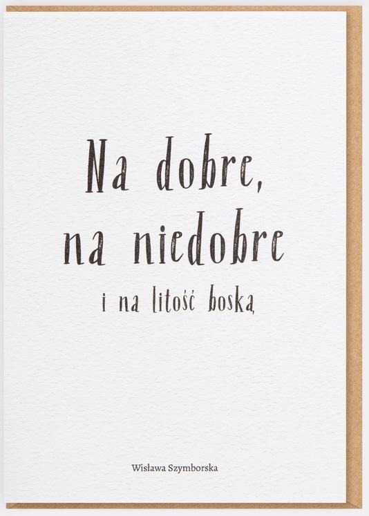Albo go ko­cha, albo się upar­ła. Na do­bre, na nie­do­bre i na li­tość bo­ską. Wisława Szymborska, „Portret kobiecy” NA DOBRE, NA NIEDOBRE I NA LITOŚĆ BOSKĄ to kartka okolicznościowa inspirowana jednym z najbardziej znanych, a zarazem najpiękniejszych wierszy Wisławy Szymborskiej. Uniwersalny, minimalistyczny wzór sprawdzi się jako dodatek do prezentu ślubnego, kartka z okazji jubileuszu ślubu i walentynka. Doceni ją każdy miłośnik literatury polskiej, zwłaszcza poezji noblistki! Kartka w zestawie z kopertą jest pusta w środku. Została wydrukowana na papierze ekologicznym. Jej wnętrze czeka na wypełnienie treścią płynącą prosto z Twojego serca! Kartka miłosna z cytatem Wisławy Szymborskiej Wymiary kartki (po złożeniu): 12 cm x 17 cm Gramatura papieru: 250 g/m2 W zestawie z elegancką kopertą z eko kraftu Wymiary koperty: 12,5 cm x 17,5 cm Gramatura koperty: 100 g/m2 Zestaw zapakowany w folię Idealna kartka okolicznościowa dla fana poezji Wisławy Szymborskiej Wyprodukowano w Polsce