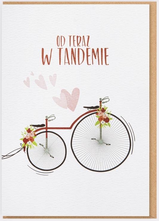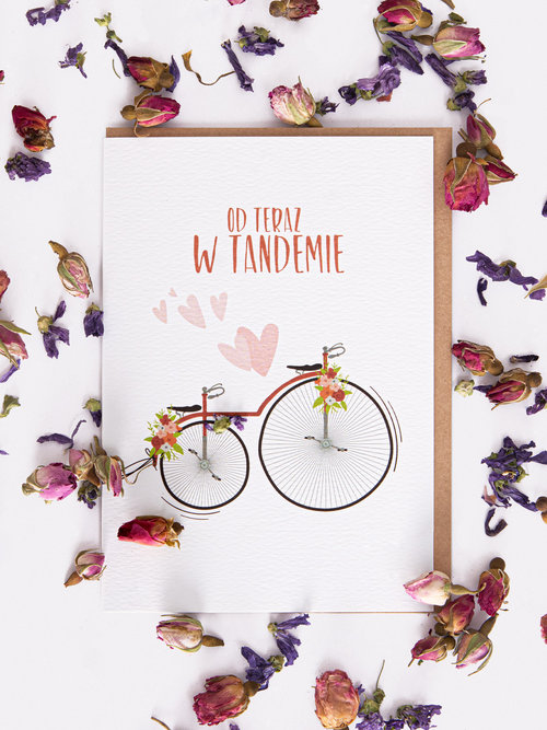 OD TERAZ W TANDEMIE to nasza oryginalna propozycja kartki ślubnej. Jesteśmy przekonani, że ten wzór docenią zarówno miłośnicy polszczyzny, jak i zapaleni cykliści. Wszak kto powiedział, że nowa droga życia nie może być ścieżką rowerową? Gorący entuzjasta turystyki pieszej i rowerowej Bolesław Prus docenia ten pomysł! Kartka okolicznościowa OD TERAZ W TANDEMIE w zestawie z elegancką kopertą poleca się jako dodatek do prezentu ślubnego dla niebanalnych osób ceniących ekologiczne rozwiązania – nie bez powodu została wydrukowana na papierze ekologicznym. Środek jest pusty – czeka na zapełnienie nieszablonową treścią! OD TERAZ W TANDEMIE - kartka dla nowożeńców Wymiary kartki (po złożeniu): 12 cm x 17 cm Gramatura papieru: 250 g/m2 W zestawie elegancka koperta z eko kraftu Wymiary koperty: 12,5 cm x 17,5 cm Gramatura koperty: 100 g/m2 Zestaw zapakowany w folię Oryginalna kartka okolicznościowa na ślub dla rowerzystów Wyprodukowano w Polsce