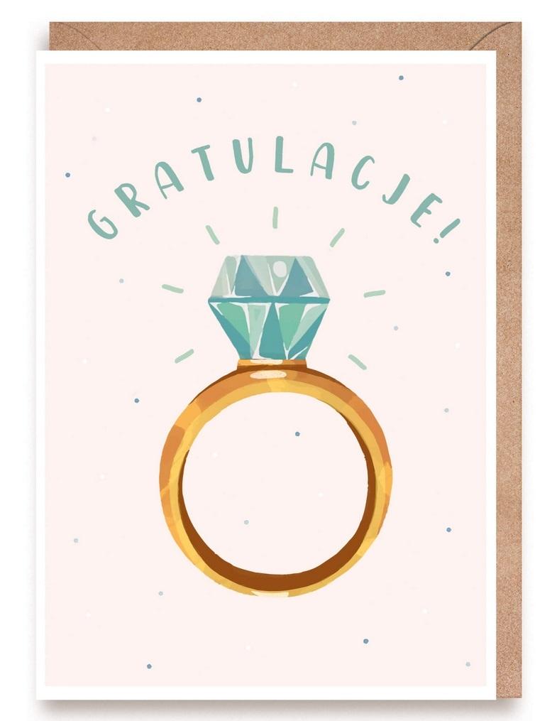 Dodatkowo, kartka zawiera delikatny wzór pierścionka zaręczynowego, który nadaje jej pewien urok i niesie ze sobą emocje związane z miłością i zobowiązaniem.