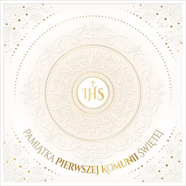 Karnet komunijny, złocony i tłoczony, tekst życzeń w środku.