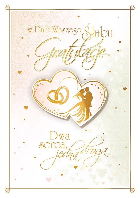 Karnet ślubny z kopertą, naklejane elementy, złocony, tekst życzeń w środku.
