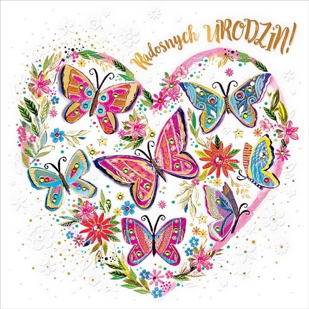 Karnet urodzinowy, złocony i tłoczony, tekst życzeń w środku.