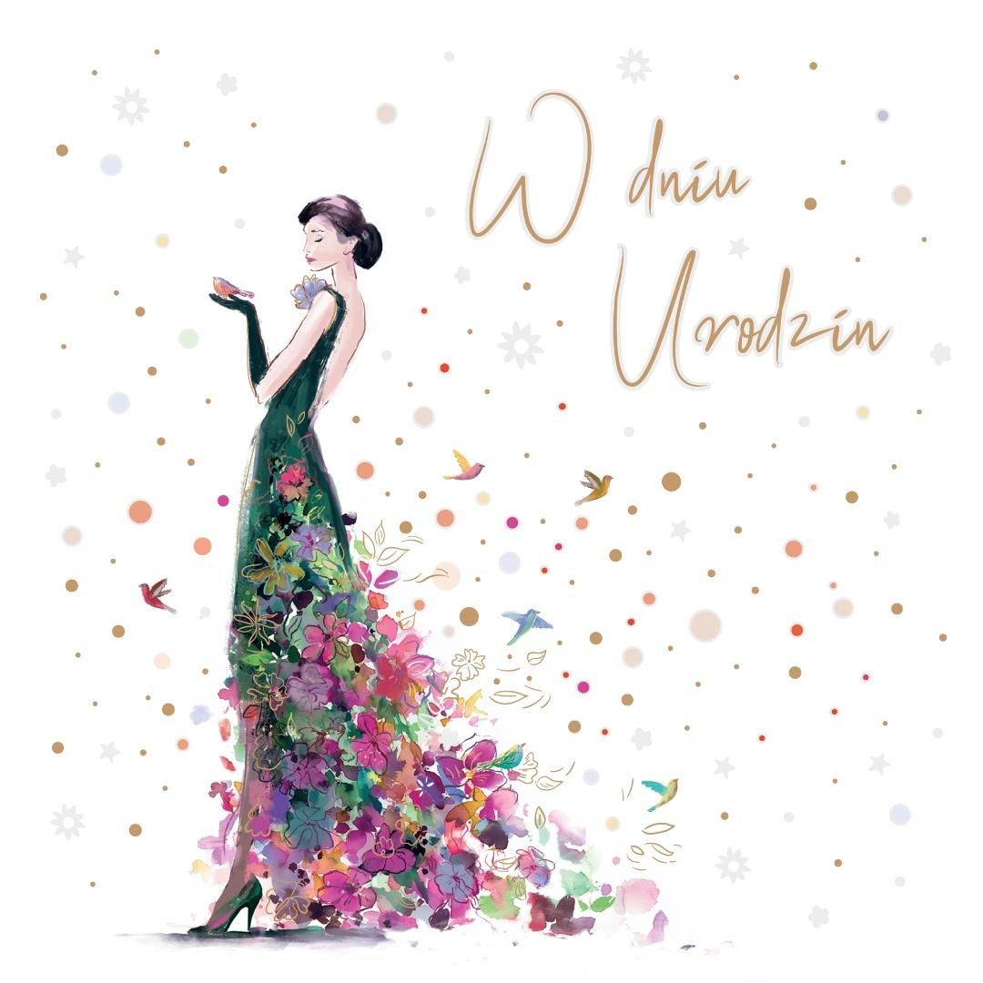 Karnet urodzinowy, złocony i tłoczony, tekst życzeń w środku.