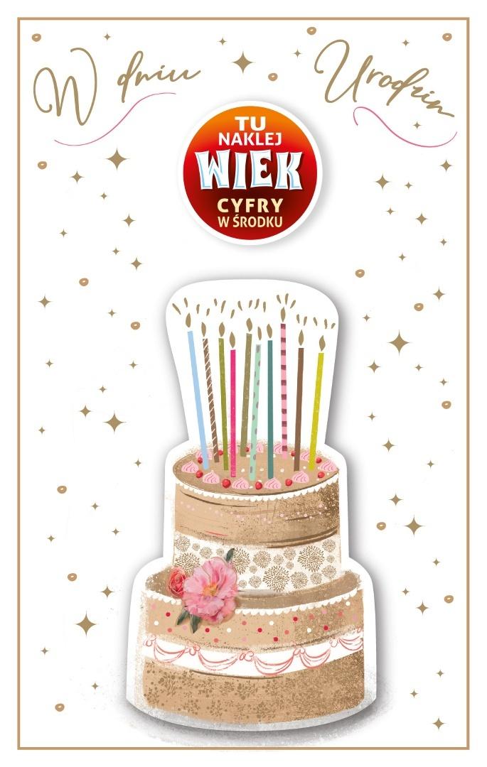 Karnet urodzinowy z życzeniami w środku, złocenie, naklejane elementy oraz naklejki z cyframi do personalizacji wieku