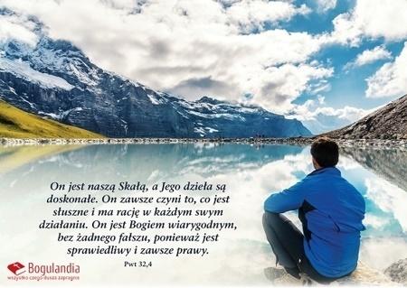 Kartka składana z kopertą. z wersetem z Pisma Świętego On jest naszą Skałą, a Jego dzieła są doskonałe. On zawsze czyni to, co jest słuszne i ma rację w każdym swym działaniu. On jest Bogiem wiarygodnym, bez żadnego fałszu, ponieważ jest sprawiedliwy i zawsze prawy. Pwt 32,4