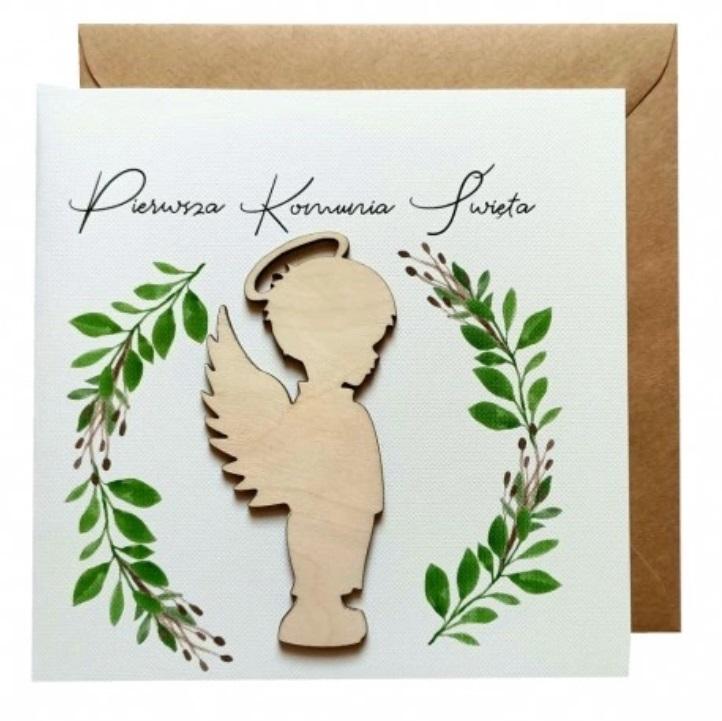 Kartka okolicznościowa z okazji Pierwszej Komunii Świętej o treści: W wielkim dniu, który zapamiętasz z wielkiej okazji jaką jest Komunia Święta dzisiaj, gdy przyjmujesz Boga do siebie mamy życzenia specjalne dla Ciebie: Niech Bóg w Twym sercu prowadzi Cię i wspiera, niech zawsze sprzyjają okoliczności byś był w życiu pełny radości.