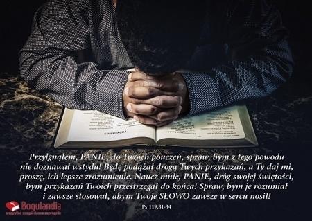Kartka składana z kopertą z wersetem z Pisma Świętego. "Przylgnąłem, PANIE, do Twoich pouczeń, spraw, bym z tego powodu nie doznał wstydu! Będę podążał drogą Twych przykazań, a Ty daj mi, proszę, ich lepsze zrozumienie. Naucz mnie, PANIE, dróg swojej świętości, bym przykazań Twoich przestrzegał do końca! Spraw, bym je rozumiał i zawsze stosował, abym Twoje Słowo zawsze w sercu nosił!" Ps 119,31-34