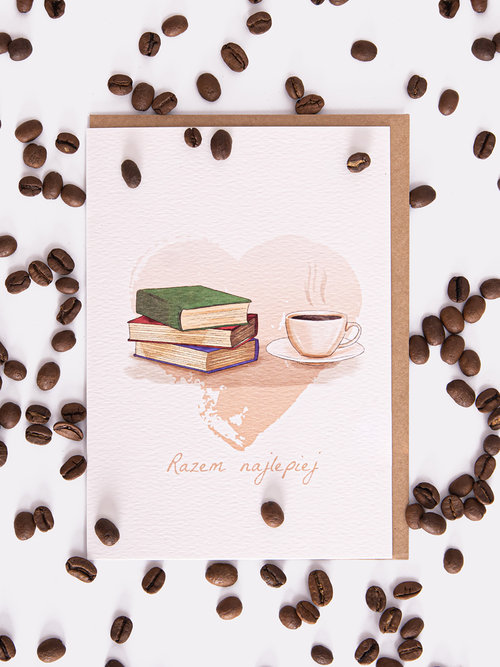 Książki i kawa to duet idealny! Kartka RAZEM NAJLEPIEJ z ich motywem idealnie sprawdzi się jako dodatek do prezentu ślubnego dla pary, która pasuje do siebie równie dobrze. Możesz ją także podarować ukochanej drugiej połówce, zwłaszcza jeśli jest kawoszem i zapalonym molem książkowym. Laurka walentynkowa z motywem literackim w zestawie z książką i ulubioną kawą to strzał w dziesiątkę! Kartka w zestawie z elegancką kopertą jest pusta w środku i została wydrukowana na papierze ekologicznym. Jej wnętrze czeka na wypełnienie treścią płynącą prosto z Twojego serca! Kartka okolicznościowa RAZEM NAJLEPIEJ - na walentynki, ślub i bez okazji Wymiary kartki (po złożeniu): 12 cm x 17 cm Gramatura papieru: 250 g/m2 W zestawie koperta z eko kraftu Wymiary koperty: 12,5 cm x 17,5 cm Gramatura koperty: 100 g/m2 Zestaw zapakowany w folię Idealna kartka miłosna dla kawoszy i moli książkowych Wyprodukowano w Polsce