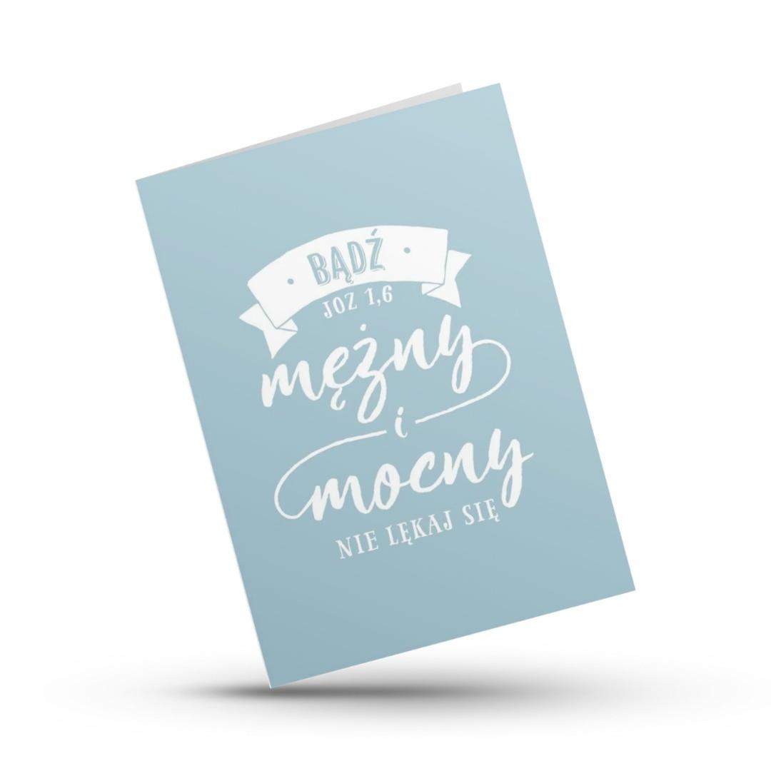 Kartka z cytatem z Księgi Jozuego 1,6 to przypomnienie o odwadze, wierze i Bożej obecności. Prosty, niebieski design podkreśla jej ponadczasowy charakter - idealna na kartkę dla mężczyzny.