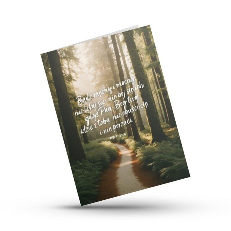 Kartka z cytatem z Księgi Powtórzonego Prawa 31,6 to wyjątkowe przypomnienie o Bożej obecności i sile, którą daje wiara. Utrzymana w tonacjach zieleni i brązu, z motywem leśnej drogi.